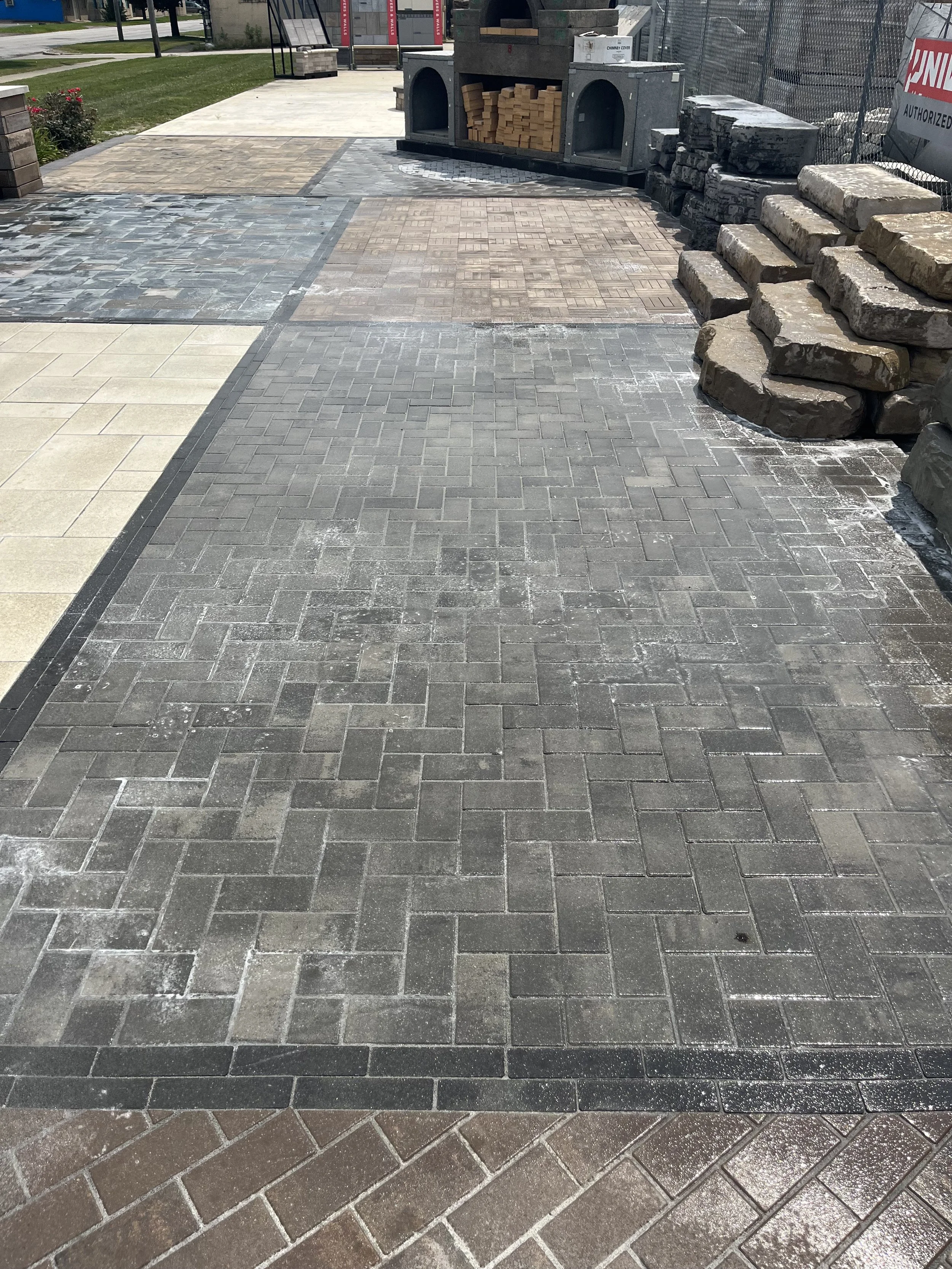 Various types of paving stones displayed outdoors, surrounded by stacked stone blocks and construction materials.